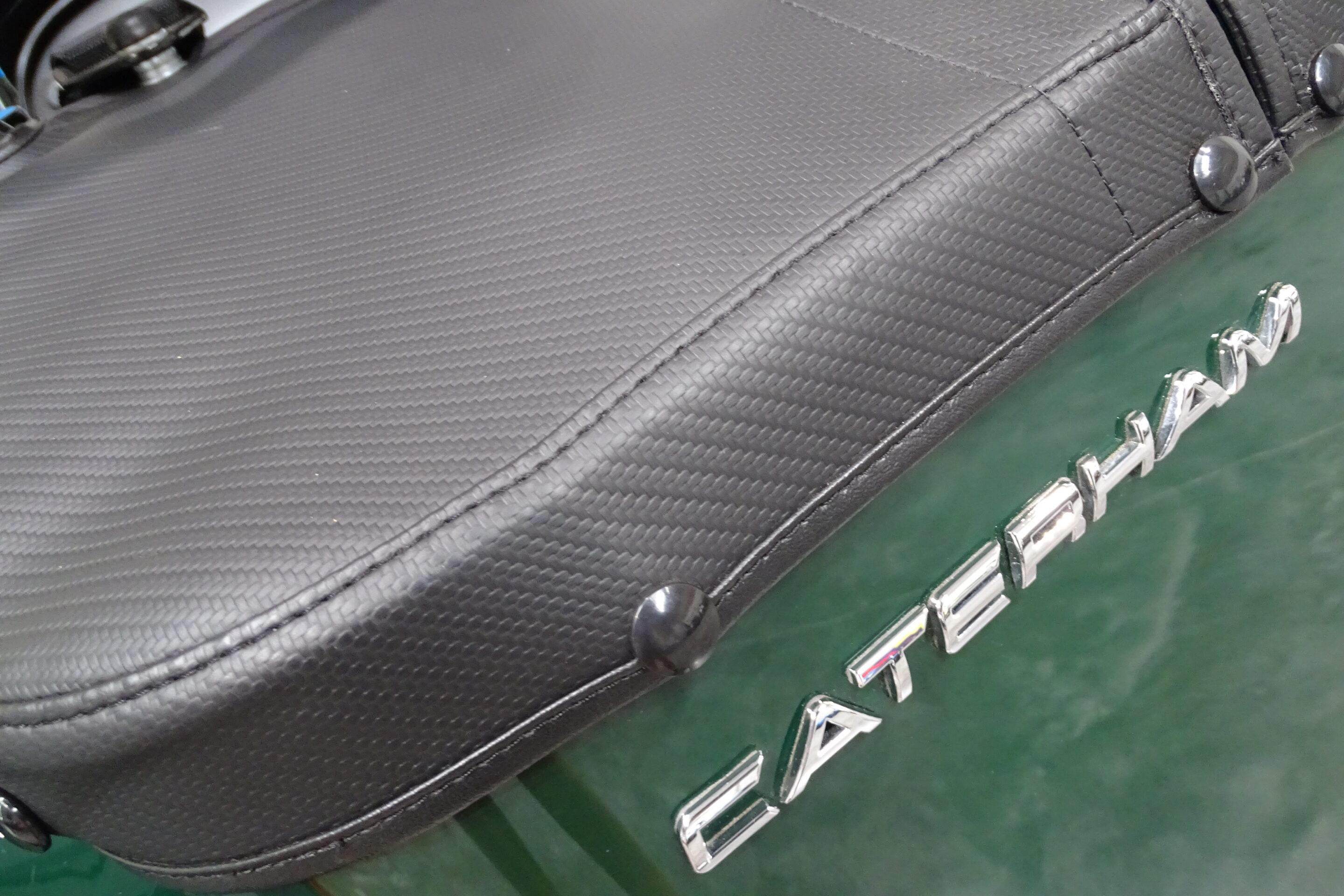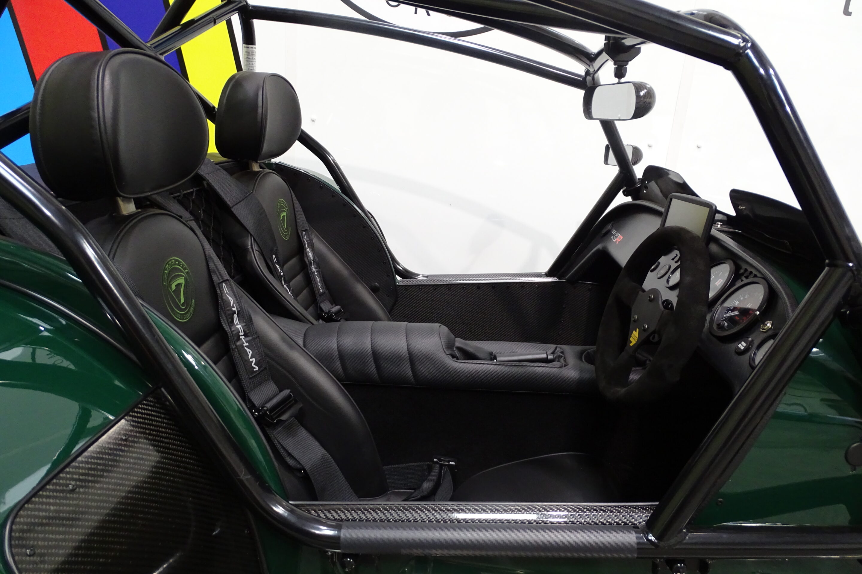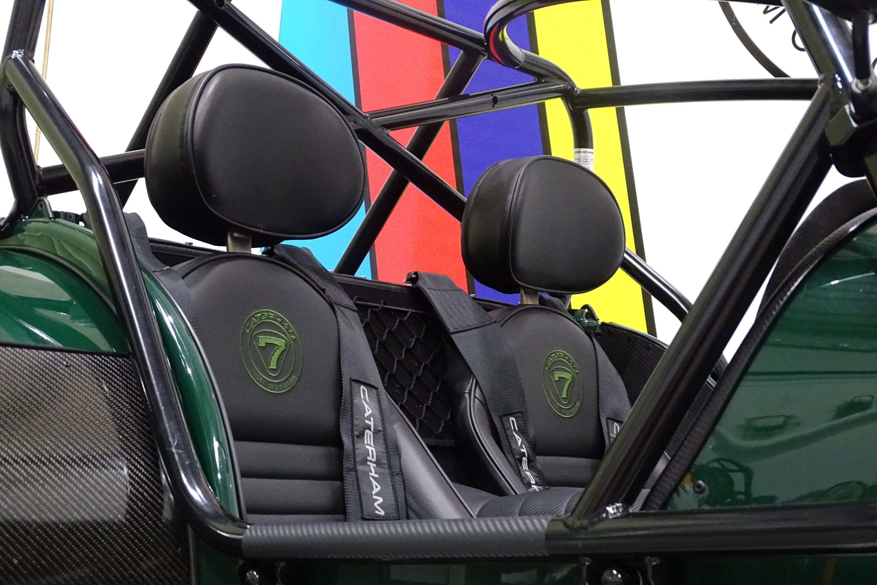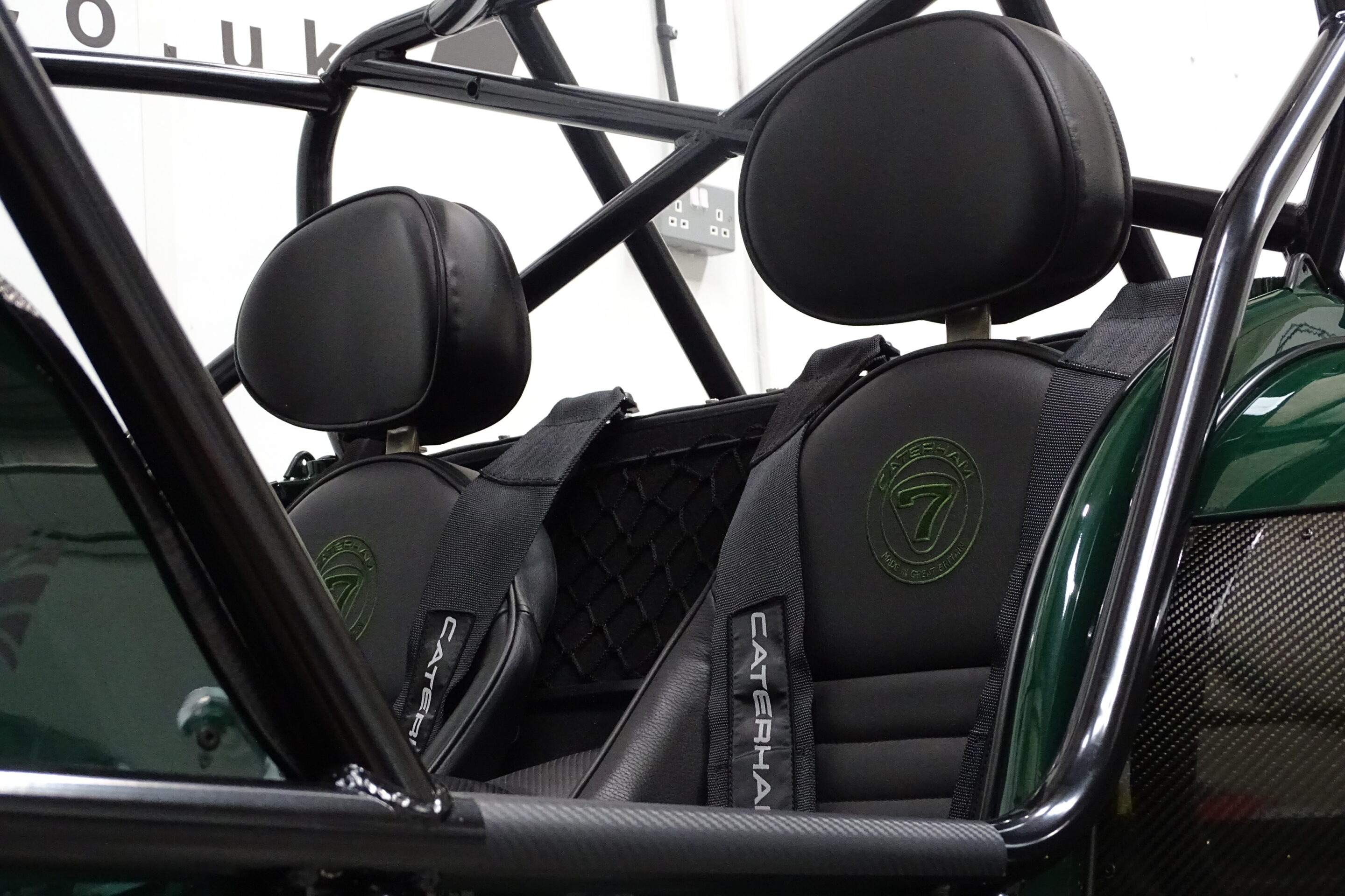 Adjustable black leather Signature seats with Green Caterham logo