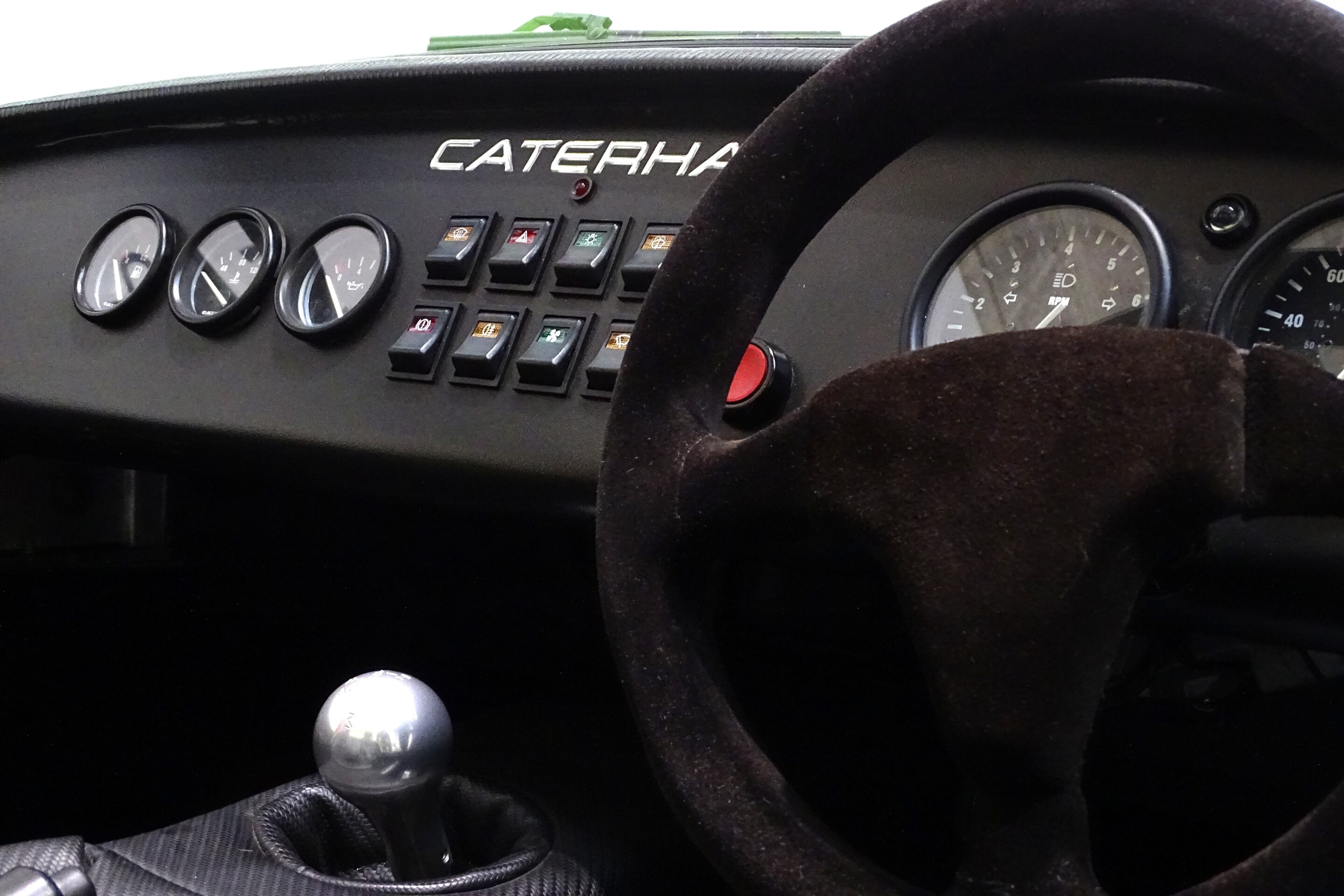 Supersports came with their own bespoke dashboard layout, which sees the standard long line of switches stacked into two rows of four in the centre of the dash, with the three dials off to their left. They also all had a single central change up light between the speedometer and the rev counter, which illuminates just before you reach the 7400rpm rev limiter. As standard they also all came Suede Momo Steering wheels, carbon vinyl tunnel tops and carbon vinyl boot covers, though some had these options exchanged for alternative options.